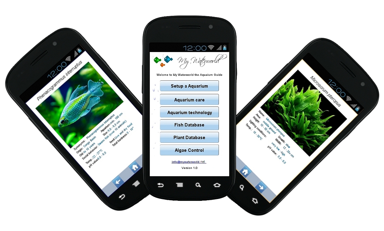 In our app "MyWaterworld - The Aquarium Guide" we want to show you, how you can set up a fresh water aquarium. We also offer you in this app some information on aquarium care, aquarium equipment and algae control. In addition, the app "MyWaterworld – The Aquarium Guide" contains a database of more than 190 freshwater fish species and over 140 plant species. In a purchase, we want to thank you in advance and we hope that this app has given you some useful information.